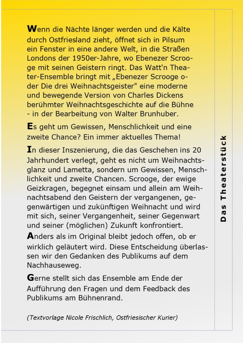 Siegfried Württemberger profitiert von seiner langjährigen Theatererfahrung bei verschiedenen Bühnen. Eindrucksvoll füllt er die Rolle mit Mimik, Gestik und dem großen Textumfang des Geizhalses Scrooge. Bei WATT´n Theater übernimmt er im Vorstand die Position des Schatzmeisters … passt doch irgendwie!